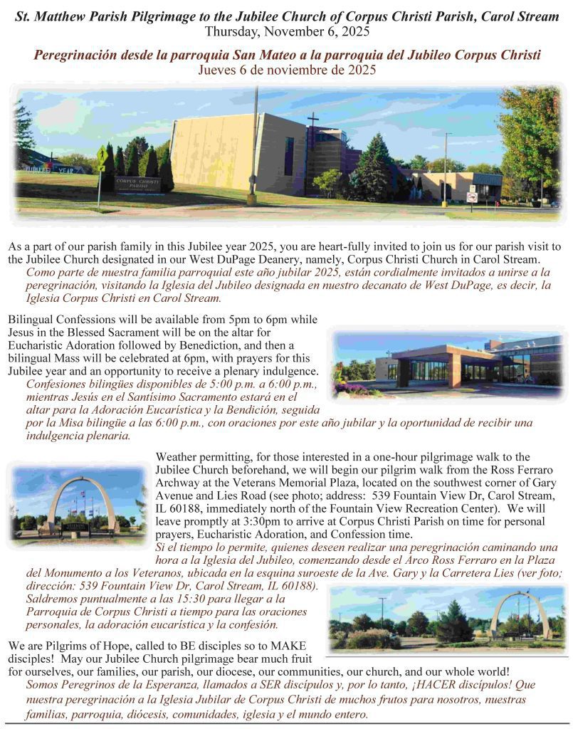 3:30 PM PROMPTLY: One-hour PILGRIMAGE WALK from Veteran’s Memorial Plaza (Archway), 539 Fountain View Drive, Carol Stream